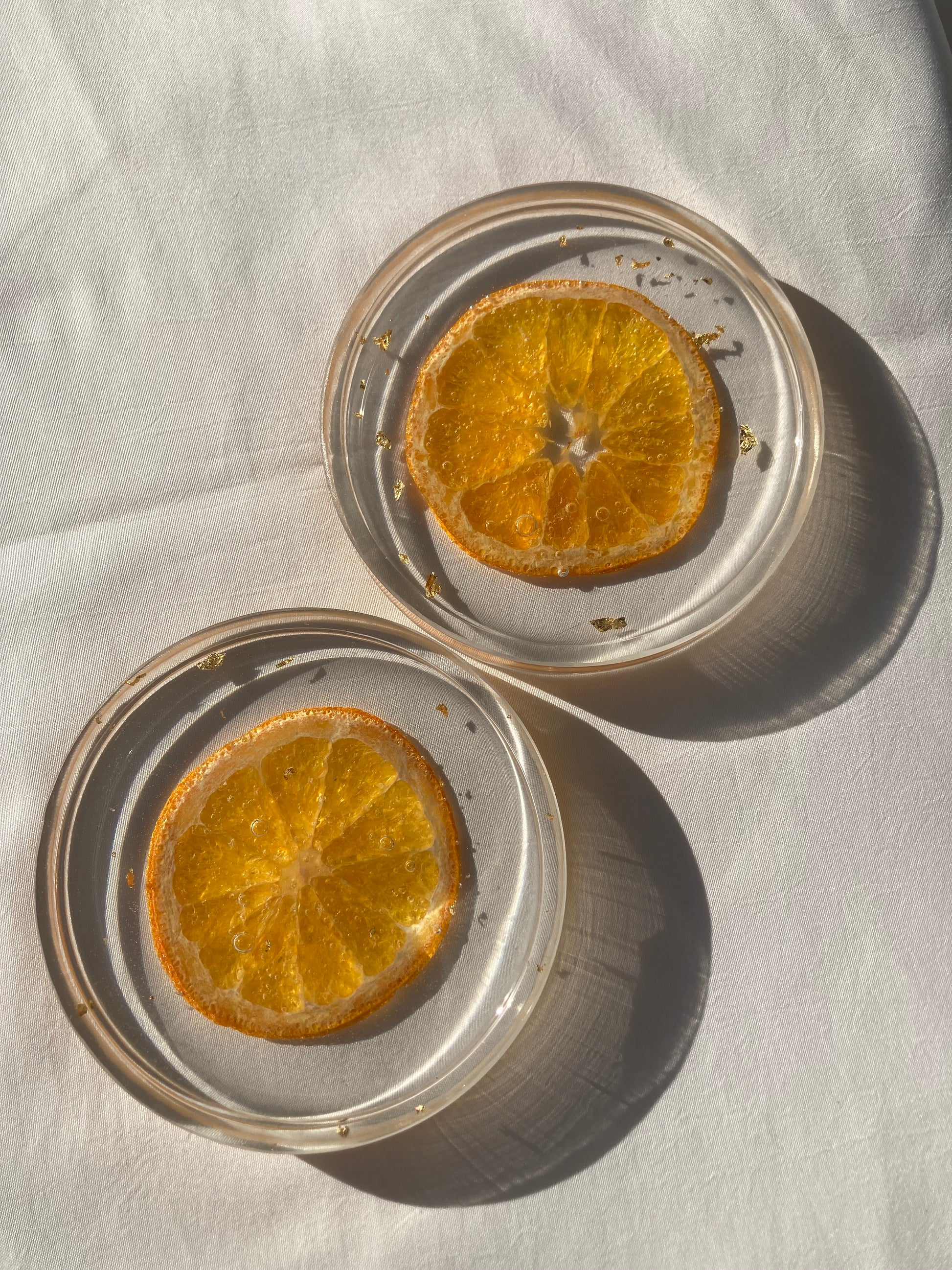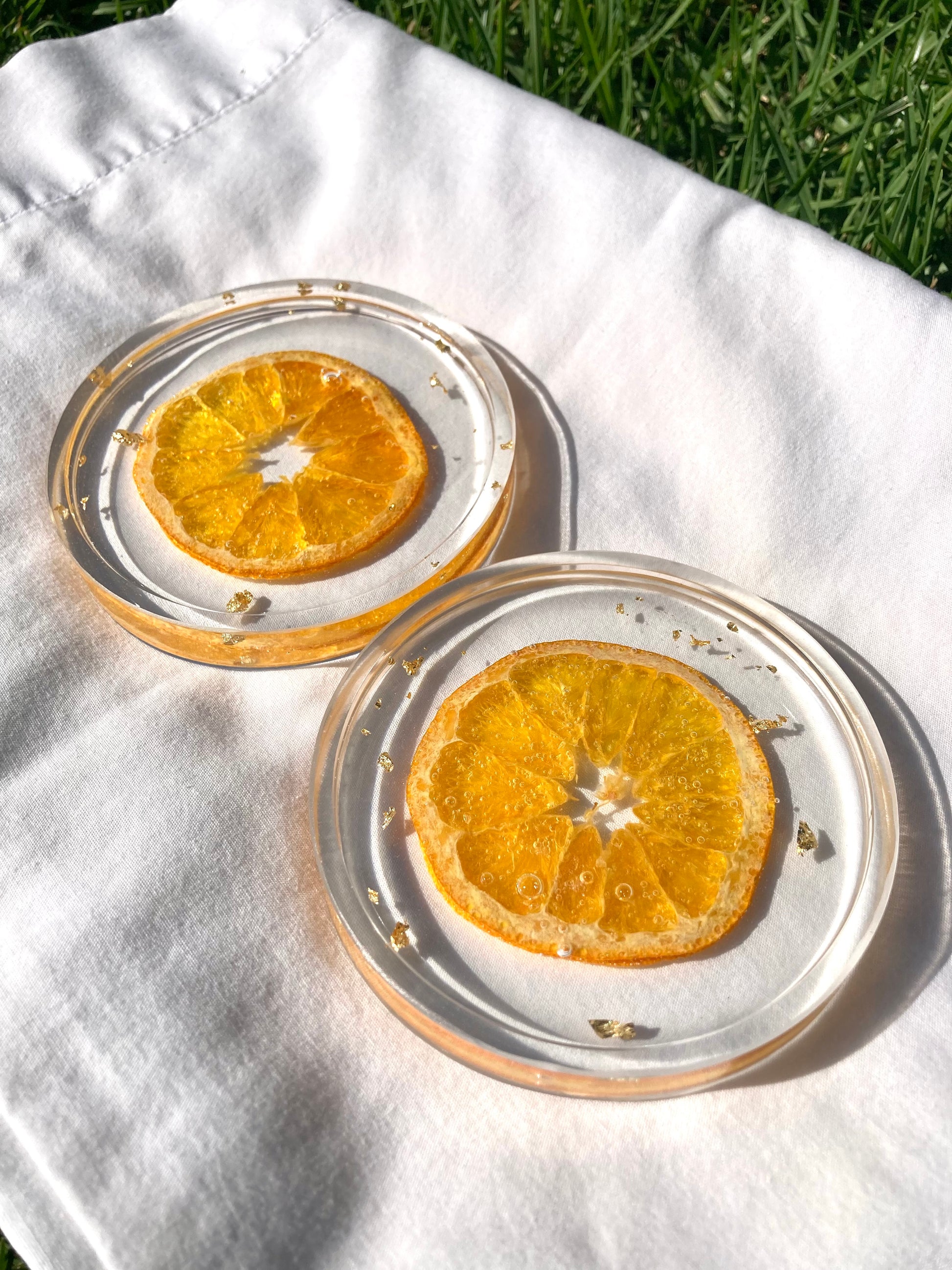 Bring a cute and one-of-a-kind decor to your home with these dried fruit handmade coasters! These are made with real dehydrated orange slices that brighten up your space! All items are made with food-grade resin and can withstand hot or cold drinks.